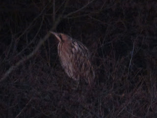 I had more luck locally than with twitching. My parents then picked me up and we headed to Godstone. I found Bay Pond and teamed up with Neil Randon and another friendly bloke. After quite a bit of waiting, I walked up to the end of the path to get another angle, looked back to the other end and saw the Bittern perched in vegetation directly opposite Neil and our friend, I ran back and we all enjoyed absolutely epic views of the bird, my best ever. I was just about to snap it when it took off and settled in a slightly more distant tree, still top views though - see record shot (at this point it was getting pretty dark). Also at Godstone were a Kingfisher, a Great Crested Grebe, a pair of Gadwall, a Mistle Thrush and a couple of Egyptian Geese. Satisfied, I went and had dinner with my parents in the Beefeater round the corner, which was very nice. Past midday it wasn't a bad day.